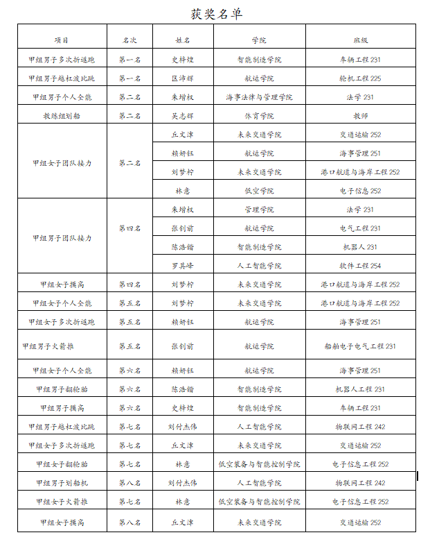 在比赛中,来自车辆工程 231 班的史梓煌同学表现突出,他既是校武术队主力队员,同时也是校体适能队的中坚力量,继上个月在武术长短兵锦标赛夺冠之后,这次体适能比赛,他又在学生甲组折回跑项目中折桂。来自轮机工程 225 班的区沛辉同学夺得学生甲组男子越杠波比跳冠军。三枚银牌得主分别是男子教练组划船机亚军吴志辉,甲组男子个人全能亚军朱增权,甲组女子团队(港口航道与海岸工程252班刘梦柠、交通运输252班丘文津、海事管理251班赖妍钰、电子信息252班林意